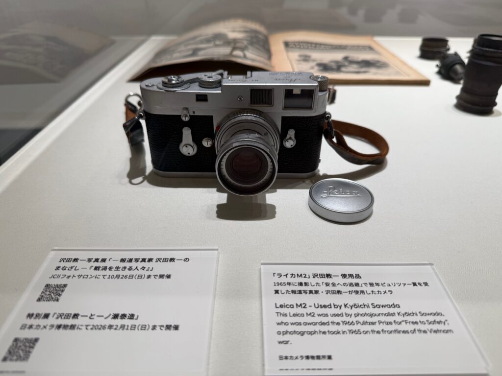 会場に入ると通路の両側の壁に写真展示が並び、通路中央にはメモリアルなカメラや書物の展示がある。