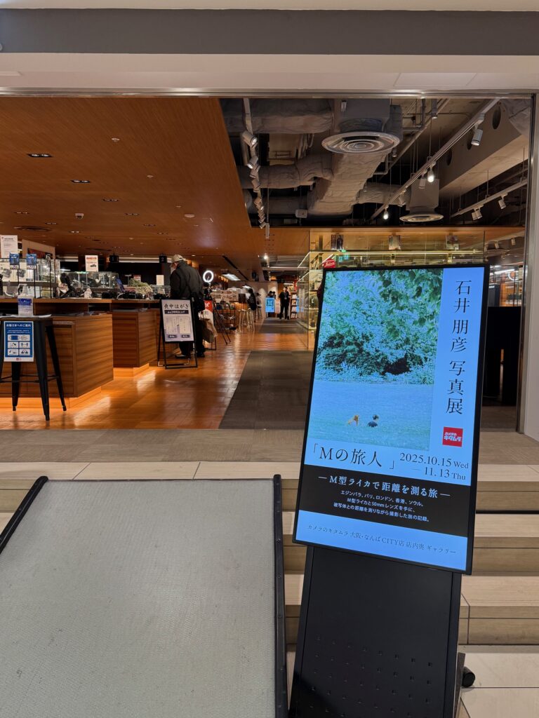 丁度、石井朋彦氏の写真展「Mの旅人」大阪展が開催中であった。この店舗はフロア面積が大きいことでも知られているため、石井氏が言うところの「距離」を意識した展示もとても面白かった。