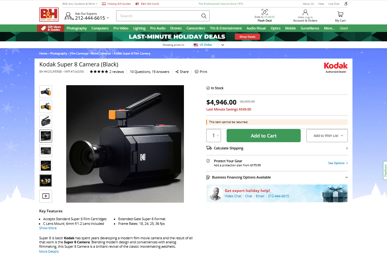 米コダックのオンラインショップからも値引きのオファーが来ていましたが「B&H PHOTO」でもセールをしております。549 USドルの割引きで、4,946USドルです。
