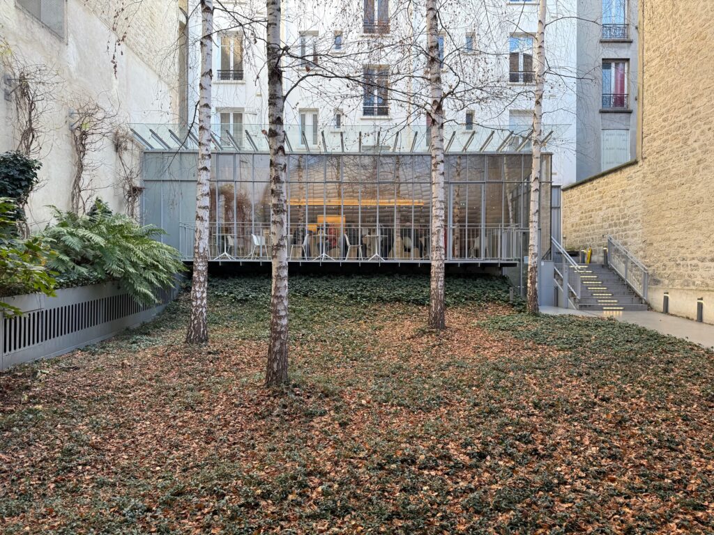 パリの歴史的街区につくられたレンゾ・ピアノによる設計は、前面道路に面した建物の歴史的なファサード(外観)を残し、その背後に昆虫のような有機的形態の外殻を最新素材を用いて建てている点が特徴である。貴重なアーカイブを包むように設計している。